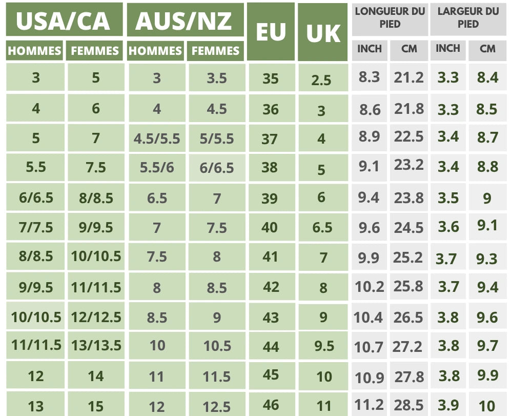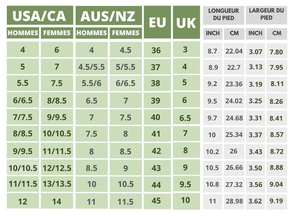 (!) AUS/NZ/EU : Nos chaussures sont fabriquées en tailles américaines. Consultez le tableau des tailles et choisissez votre taille en taille américaine !